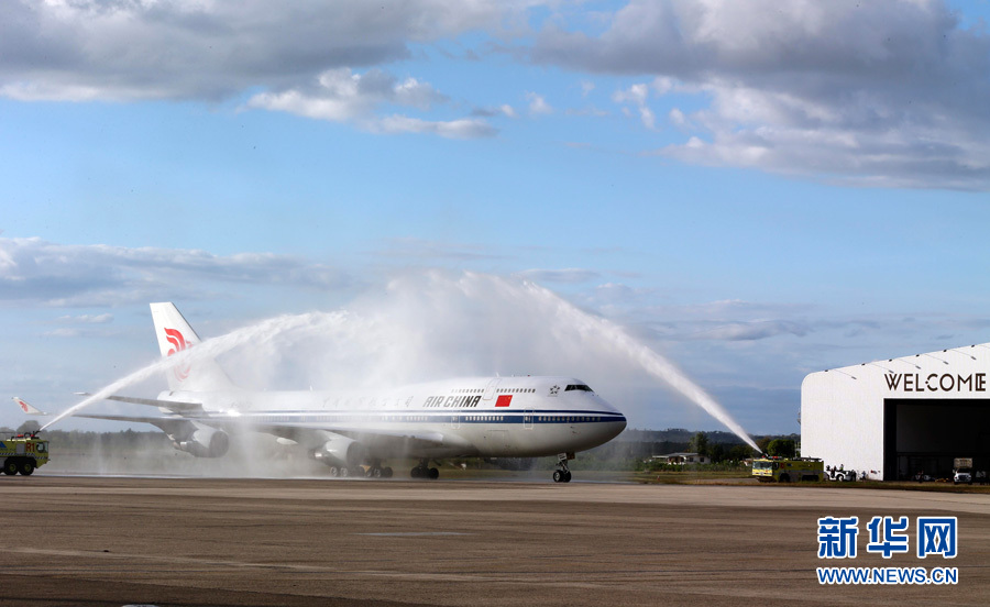 11月21日,国家主席习近平抵达楠迪,开始对斐济进行国事访问并将同太平洋建交岛国领导人举行会晤。图为习近平乘坐的专机在楠迪国际机场跑道上滑行穿过“水门”,这是当地给予最尊贵客人的礼遇,表达为客人“洗尘”。 新华社记者丁林摄