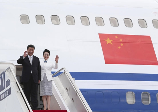 11月21日,国家主席习近平抵达楠迪。图为习近平和夫人彭丽媛步出机舱。(摄影 丁林)