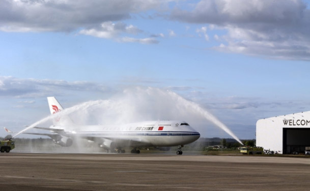 11月21日,习近平乘坐的专机在楠迪国际机场跑道上滑行穿过“水门”,这是当地给予最尊贵客人的礼遇,表达为客人“洗尘”。 (摄影 丁林)