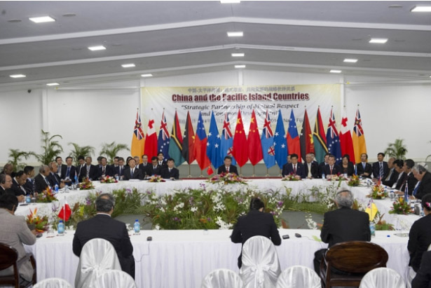 会议厅宽敞明亮,背景布上醒目地用中英文写着“中国—太平洋岛国:相互尊重、共同发展的战略伙伴关系”。这一伙伴关系的确立,是习主席和8位岛国领导人一致同意的重要成果。背景布前面摆着中国和8个太平洋岛国的国旗,很是好看。整个会议厅,被布置得喜气洋洋。