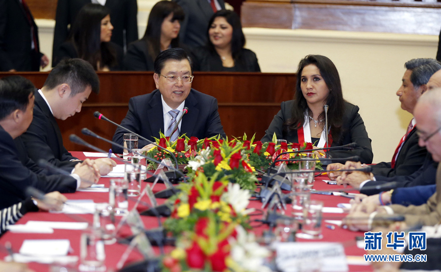 11月21日,正在秘鲁进行正式友好访问的全国人大常委会委员长张德江在利马与秘鲁国会主席索洛萨诺举行会谈。 新华社记者鞠鹏摄