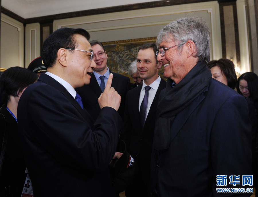 12月18日,中国国务院总理李克强在贝尔格莱德市政厅接受“贝尔格莱德荣誉市民”证书,塞尔维亚总理武契奇陪同出席。随后,李克强同塞各界知名人士亲切会见并互动交流。这是李克强同著名足球教练米卢蒂诺维奇亲切交谈。新华社记者 饶爱民 摄