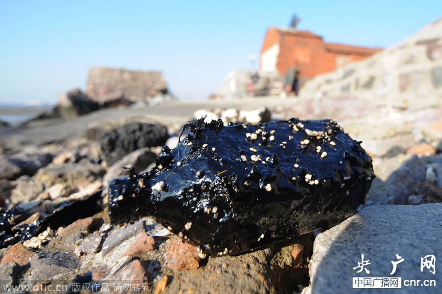 青岛胶州湾海滩现200米长原油污染带