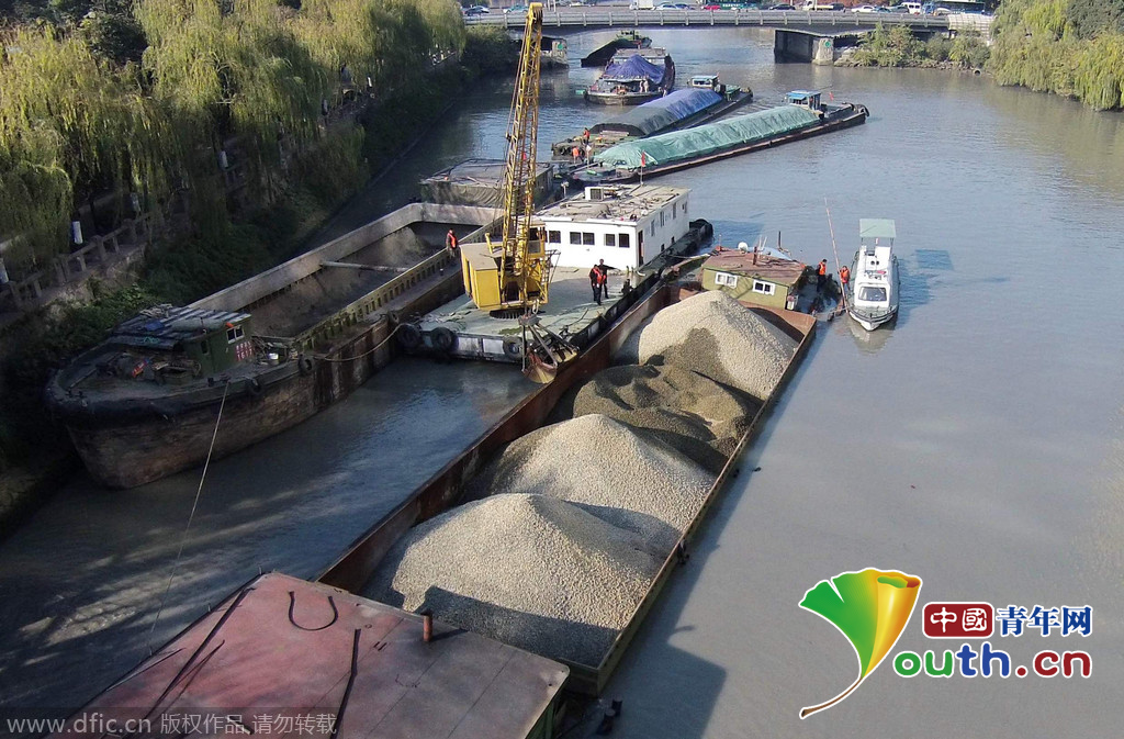 2014年12月22日7时30分许,满载一船砂石的浙桐庐货00579货船,在运河中北桥附近水域搁浅,船身倾斜进水。海事部门对事发水域实施交通管制,调来救援船只,搬运砂石,全力抢险。9时55分,水面交通逐步恢复。图片来源:东方IC