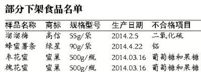 另外,在北京华联超市石景山分公司销售的一种“贝斯玛”黑森林蜂蜜(350克/瓶,14/01/2014),也因葡萄糖和果糖不合格被下架。市食药监局提醒,凡已购买上述不合格批次食品的消费者可凭购物小票和外包装向销售单位要求退货。(记者廖爱玲)