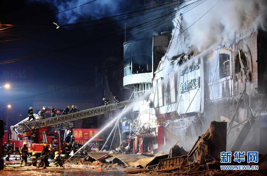 1月2日晚,消防战士在哈尔滨仓库大火现场灭火救援。1月2日13时许,哈尔滨北方南勋大市场仓库发生大火,22时火场所在居民楼发生坍塌导致多名消防战士被埋。截至1月3日凌晨1时,已造成消防官兵2死11伤,其他人员仍在搜救中。新华社记者王建威摄