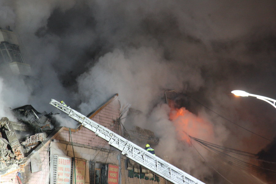 2015年1月3日凌晨,黑龙江省哈尔滨市,2日13时许,哈尔滨北方南勋大市场仓库大火持续了9个多小时仍未扑灭,22时突然发生塌方,参与救援的多名消防战士被埋。