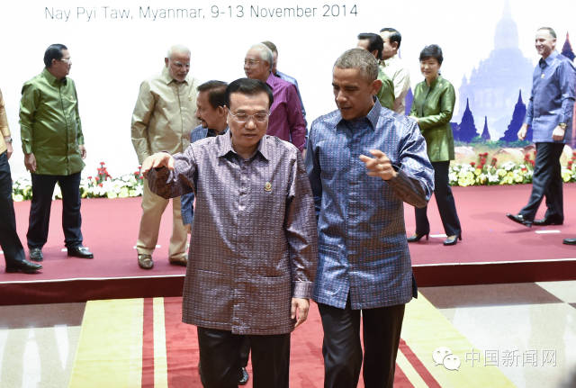11月12日下午李克强总理在人民大会堂会见美国总统奥巴马后,前往缅甸首都内比都出席第九届东亚峰会。在当晚举行的晚宴上,身着缅甸特色服装的李克强与奥巴马再次见面交谈。
