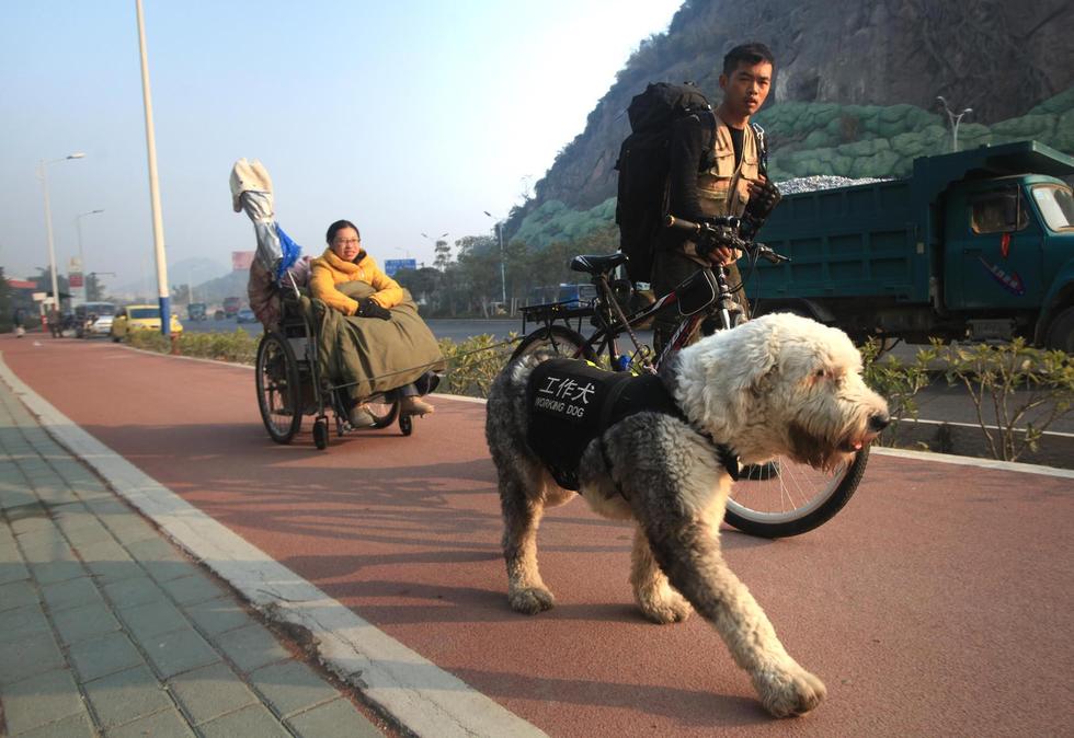 2015年01月03日,广西壮族自治区柳州市,柳州85后小伙丁一舟,为完成患病女友心愿,用一辆单车,一只工作犬,拉着女友的轮椅,1月3日从柳州出发开始爱心之旅。他们准备环游全国,在地图上“走”出一个心形路线。