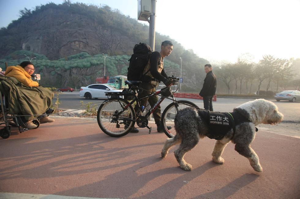丁一舟用一辆单车,一只工作犬,拉着女友的轮椅迎着早晨的阳光开始环游全国的征途。