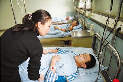 1月3日,在哈尔滨医科大学附属第一医院门诊部监护室里,受伤消防队员张宇的姐姐在床边陪护。