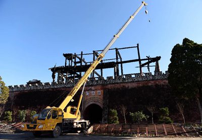 图为1月3日,一台工程机械在被火灾烧毁的云南巍山古城拱辰楼前施工。当日2时49分,大理白族自治州巍山县南诏镇拱辰楼发生火灾,经全力扑救,截至4时48分火情全部扑灭,拱辰楼基本被烧毁。新华社记者 蔺以光摄