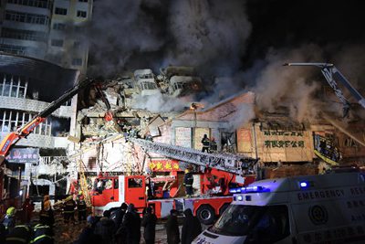 图为1月2日深夜,救援人员在哈尔滨仓库火灾现场工作。1月2日13时许的哈尔滨北方南勋大市场仓库大火持续至3日零时许。本次火灾造成5名消防员遇难。新华社发