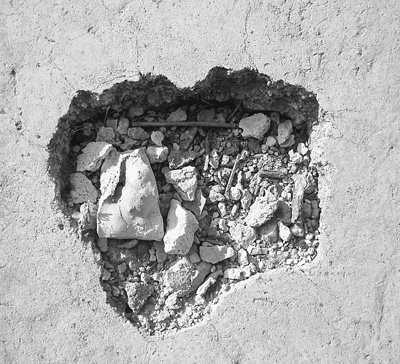 如此豆腐渣工程还造成西坝上数十个窟窿的形成。泌阳县水利局称西坝迎水坡的数十个窟窿,其实是水库上游砼护坡排水孔,为工程设计内容。但排水孔和窟窿是两码事。我们看到东西两坝一共有十几个圆形的排水孔,口内插有约4寸长的白色塑料胶管。但西坝除了几个排水孔,还有数十个窟窿,我们仔仔细细地观察这些大大小小不同规则的窟窿,发现水泥中含有大量杂质,水泥含量极少。