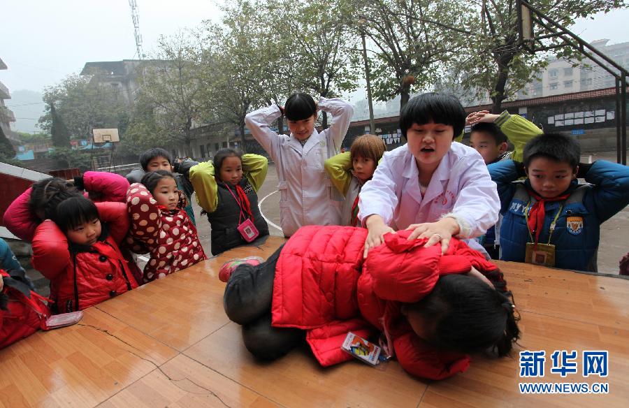 1月5日,四川省泸州市龙马潭区莲花池街道社区卫生服务中心的医务人员走进该区农民工子弟学校江北小学,为该校学生讲解预防踩踏事故知识和自救技能。新华社发(刘传福 摄)