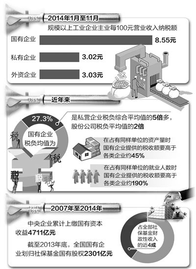 近日,在2014国有企业改革发展研讨会上,国务院国资委研究中心主任楚序平表示,从2014年1月至11月中国规模以上工业企业主业每100元营业收入纳税率来看,国有企业税负为其他企业的两倍多,这一观点引发热议。