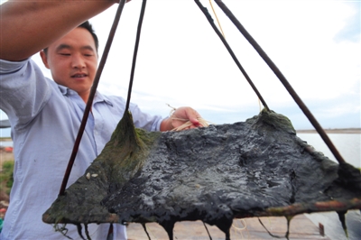 2011年9月3日,河北乐亭,虾池里打捞上来的黑色黏稠物。康菲溢油导致3万亩虾池成油池,养虾户损失2亿,此后21名养殖户曾对康菲提起诉讼。图/CFP