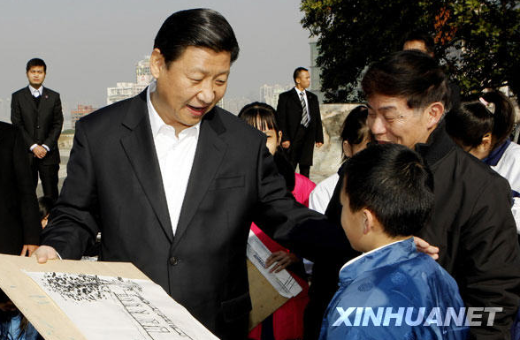 2011月11日,国家副主席习近平在澳门著名古迹大炮台参观时与在此画画的小朋友交谈。