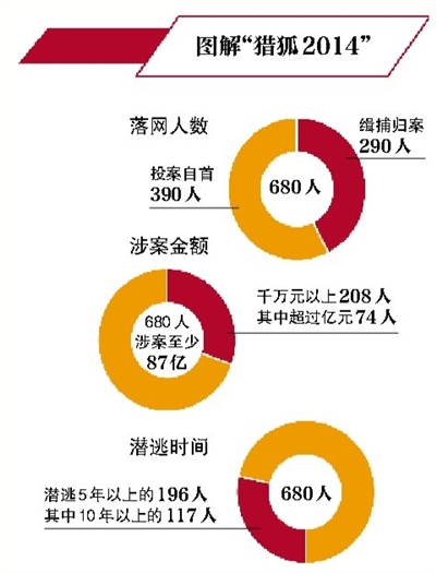 半年来,“猎狐2014”专项行动从69个国家和地区成功抓获外逃涉嫌经济犯罪人员680人,是2013年的4.5倍。