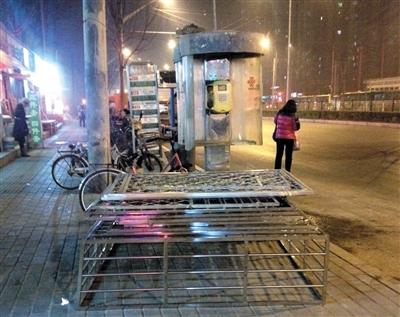 在朝阳区青年路南口公交站旁的2台公用电话机,一台仅能使用IC卡、201电话卡,另一台可以使用一卡通打电话。1月9日,在这台可以使用一卡通的公用电话旁,放置着多个长宽各2米的塑钢窗,使人很难靠近电话机。记者在该处停留半小时观察,2名等车的乘客因手机没电,试图使用该公用电话,其中一名女士站在塑钢窗旁使劲伸手,仍未能够到听筒。