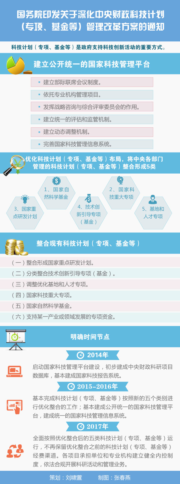 《方案》明确了改革的实施进度,提出按照整体设计、试点先行、逐步推进的原则,经过三年的改革过渡期,到2017年,全面完成改革,按照优化整合后的五类科技计划(专项、基金等)运行,并建成公开统一的国家科技管理平台。