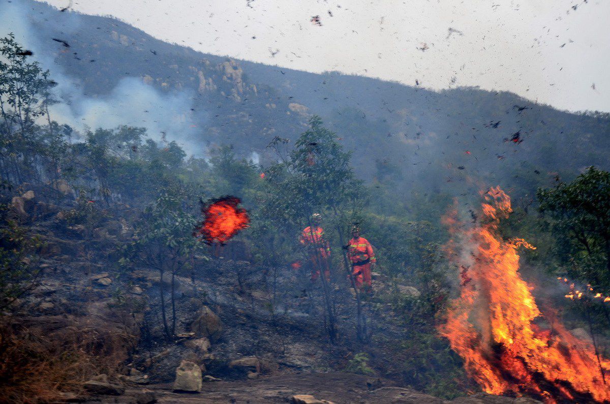 2015年1月12日,浙江温岭多处山头失火,由于天干物燥杂木众多,加上风助火势,山火带绵延上千米山头,温岭森林消防调派了辖区上百名森林消防员前往进行扑救,预防火势蔓延到山脚下民居。CFP