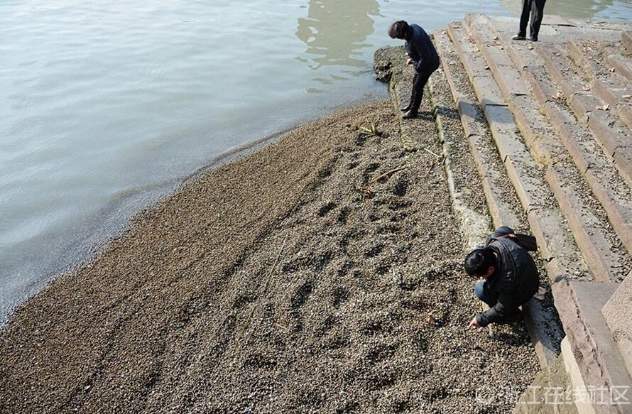 近日,京杭大运河杭州丽水路段一小码头处,大量死螺蛳和贝类出现在岸边,因腐烂而散发出强烈异味。"