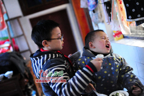 小熠的奶奶今年80岁,腿脚不好,行动不便。小熠搀着奶奶从客厅走到饭桌前坐下,又回头哄弟弟吃饭。大概是由于饭菜不合胃口,3岁的弟弟闹腾着不肯吃:“不要不要,我不吃青菜!”小熠耐心地一勺一勺喂,哄他:“不吃青菜长不大哦,吃完给哥哥给你放动画片看,好不好?”“不,哥哥坏蛋……”