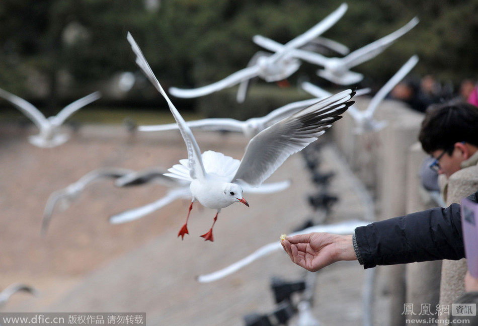 青岛栈桥边,市民喂食海鸥。