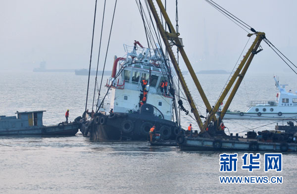 1月17日,工作人员登上扶正后的“皖神舟67”沉船。新华社记者 沈鹏 摄