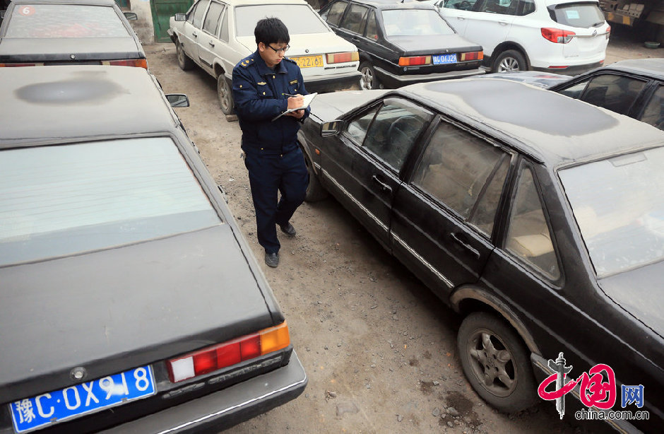2015年1月15日,河南省伊川县, 非法教练车停放在停车场,运管所工作人员清点车辆。图片作者:popcorn/CFP
