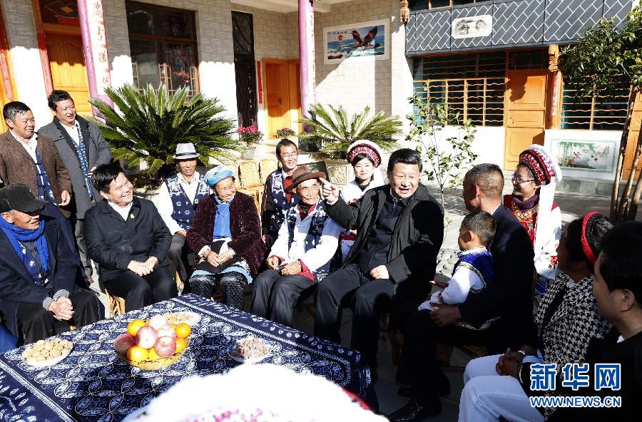 1月19日至21日,中共中央总书记、国家主席、中央军委主席习近平来到云南昭通、大理、昆明等地,看望鲁甸地震灾区干部群众,深入企业、工地、乡村考察,就灾后恢复重建和经济社会发展情况进行调研。这是1月20日,习近平来到大理白族自治州大理市湾桥镇古生村村民李德昌家,同村民们围坐在一起亲切拉家常。 新华社记者 鞠鹏 摄