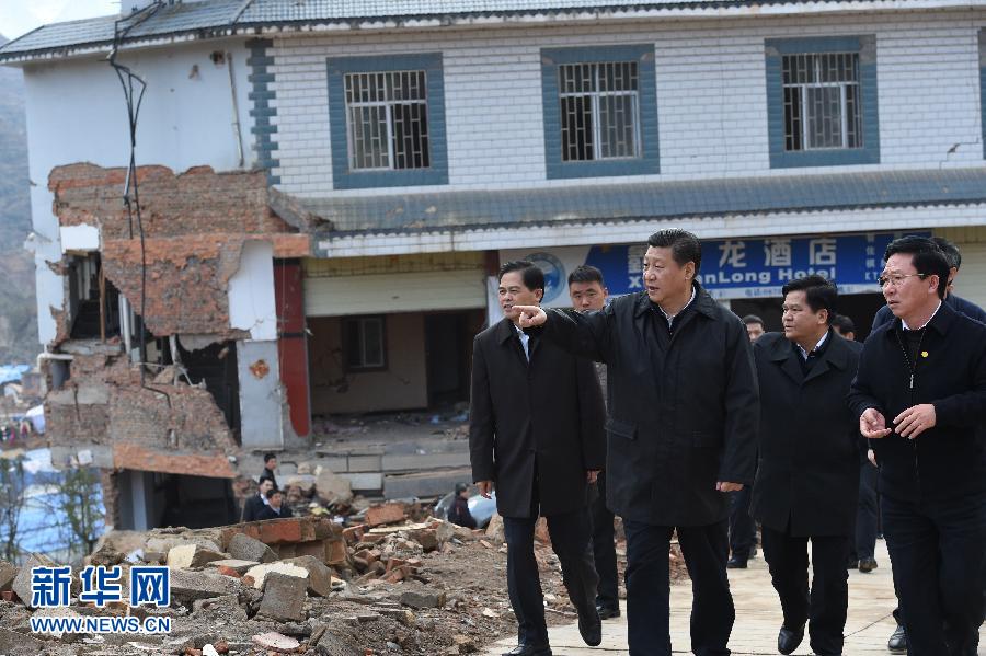 1月19日至21日,中共中央总书记、国家主席、中央军委主席习近平来到云南昭通、大理、昆明等地,看望鲁甸地震灾区干部群众,深入企业、工地、乡村考察,就灾后恢复重建和经济社会发展情况进行调研。这是1月19日,习近平在鲁甸县龙头山镇,踏上废墟查看灾情。 新华社记者 张铎 摄