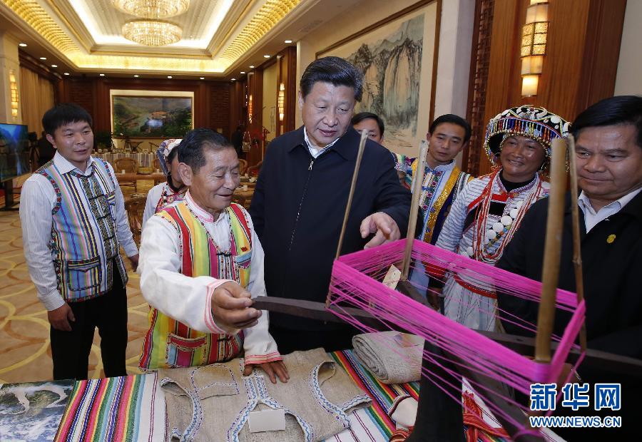 1月19日至21日,中共中央总书记、国家主席、中央军委主席习近平来到云南昭通、大理、昆明等地,看望鲁甸地震灾区干部群众,深入企业、工地、乡村考察,就灾后恢复重建和经济社会发展情况进行调研。这是1月20日,习近平向独龙族群众代表询问民族特有生产工具使用情况。 新华社记者 鞠鹏 摄