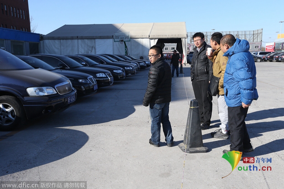 2015年1月21日上午,北京新发地汽车市场的工作人员在拍卖车辆外围拉上了线,但还是有一些买主提前来打探消息。