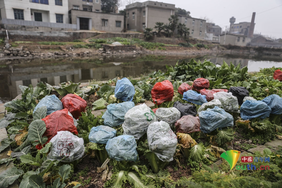 村民种植的白菜长大后都用塑料袋蒙着,怕工厂排出的废气落在上面。