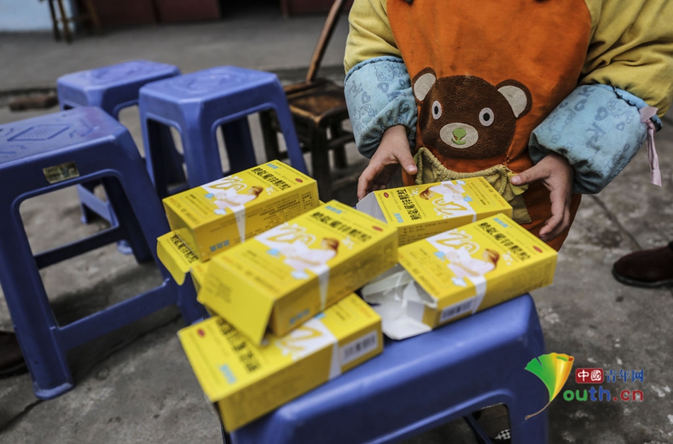 一名血铅超标的儿童和用于排铅的药物,据社区干部介绍该村儿童血铅超标率几乎是百分之百。
