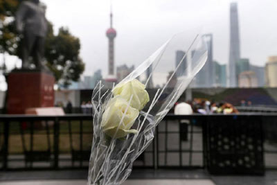 图为1月6日,市民在上海外滩陈毅广场向踩踏事件遇难者献花致哀。当日是上海外滩踩踏事件发生的第7天。 新华社记者 丁汀 摄