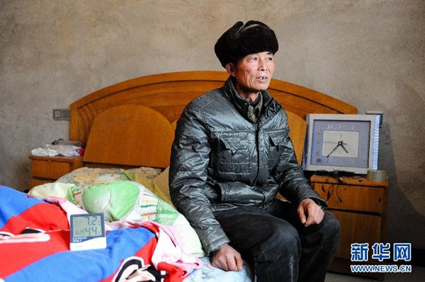 江苏省淮安市淮阴区袁北村村民尹万顺在家中。尹万顺家没有取暖设备,白天得穿五件衣服御寒(1月6日摄)。
