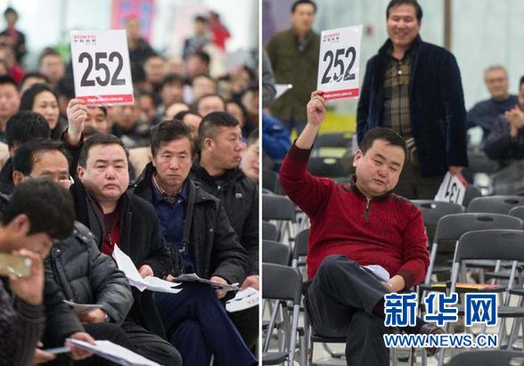 这是一张拼版照片:1月25日,252号竞拍者举牌拍得当天公车拍卖的第一辆车(左图)和最后一辆车(右图)。当日,中央和国家机关公车改革取消车辆首场拍卖会在北京举行,106辆公车全部拍出。“首、末”两车均被252号竞拍者拍得。 新华社记者 罗晓光 摄
