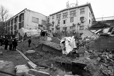 26日下午,施工人员在德胜门内大街93号院塌方现场抢修自来水、电力等管线。目前塌方现场已竖起围挡,与之相邻的德胜门内大街已恢复北向南方向的通行。1月24日凌晨, 德胜门内大街93号院的一处民宅因房主偷挖地下室发生坍塌,出现10余米深坑。当天中午,该民宅正房与北侧4间房屋先后倒塌并陷入大坑之中。本报记者 孙戉摄