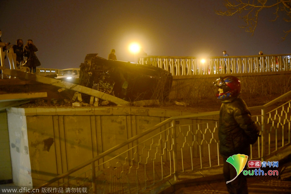 下午4时30分,记者赶到事发现场,看到出事轿车冲出围栏侧翻在低于路面约一米的绿化带上。钢筋混凝土材质的围栏被撞毁约3米,桥面上有约80米左右的黑色刹车痕迹,车辆周围散落着大量水泥块与车体碎片,车前保险杠也被撞飞到离车三四米远的地方。车内人员已被转移,现场无交警。周围不少围观市民对此议论纷纷,“晚高峰堵成这样还能把围栏撞了,这车开得太猛了。”