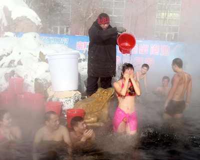 1月28日,吉林市上演了一场寒冬腊月“冰桶挑战”赛。当天气温低至零下22摄氏度。10名挑战者身着泳装站在温泉池水中,工作人员将5公斤桶装冰水从挑战者头上浇下。此次冰桶挑战募得的慈善资金将全部捐献给困难残疾人群体。