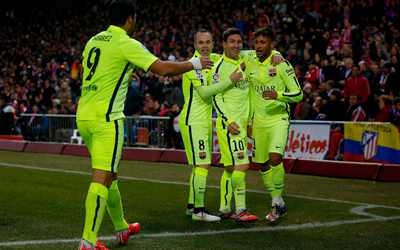 北京时间1月29日04:00(西班牙当地时间28日21:00),2014/15赛季西班牙国王杯1/4决赛次回合在卡尔德隆球场展开角逐,巴塞罗那客场3比2取胜马德里竞技,托雷斯和劳尔-加西亚进球令马竞两度领先,内马尔梅开二度,米兰达自摆乌龙,加比和马里奥-苏亚雷斯先后被罚下。巴萨总比分4比2晋级。