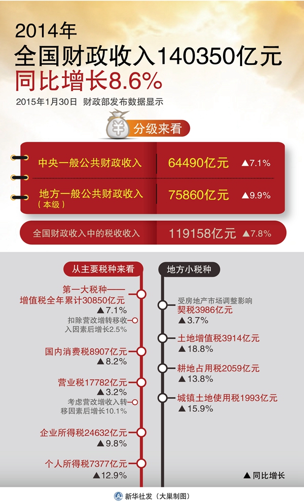 新华网北京1月30日电(记者申铖、韩洁)财政部30日发布数据显示,2014年,全国财政收入140350亿元,同比增长8.6%。这是1991年之后,财政收入增速首度跌入个位数。