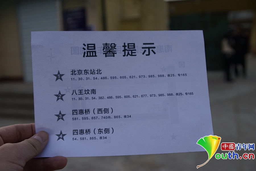 北京东站为乘客提供的出行提示,标明的车站附近的公交线路。中国青年网记者 张炎良 摄