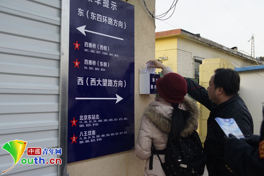 为迎接燕郊至北京的三趟临客开通,北京东站专门在出站口外制作了指示牌,方便乘客换乘公交出行。中国青年网记者 张炎良 摄