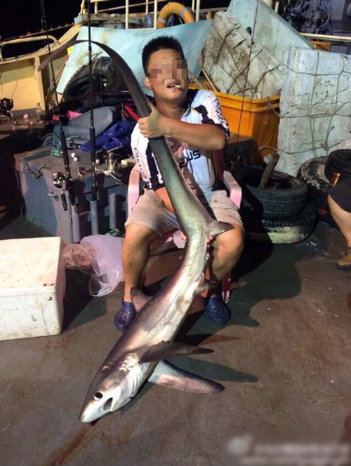 长尾鲨已被国际自然及自然资源保护联盟列为濒危物种。图为男子与在西沙猎捕的长尾鲨合影。(资料图,转自南海网)