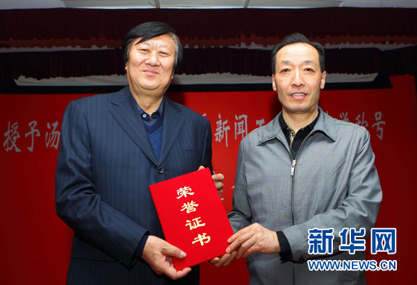 2月2日,中国记协党组书记翟惠生向新华社记者汤计(左)颁发荣誉证书。新华社记者 殷刚 摄