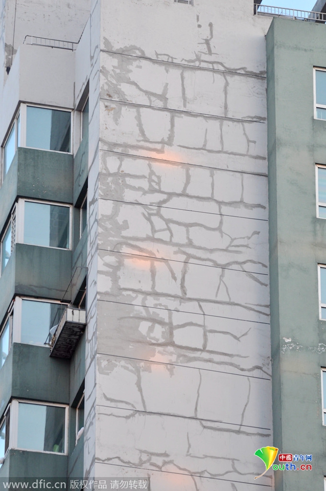 2015年2月1日,辽宁省沈阳市,卫工佳苑小区共9栋大楼外墙集体出现爆裂纹市民称“绷带楼”。近日,绷带楼业主将自家外墙涂饰水泥遮丑治愈伤痕效果显著。